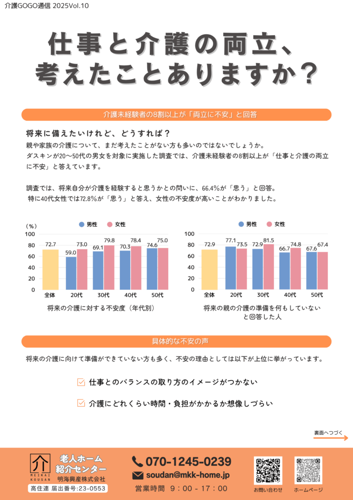 ダスキンが20~50代の男女を対象に実施した調査では、介護未経験者の8割以上が「仕事と介護の両立に不安」と答えています。