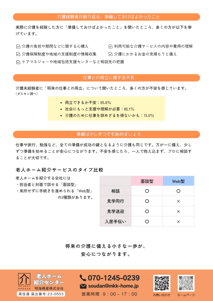 仕事や旅行、勉強など、全ての準備が成功の鍵となるように介護も同じです。万が一に備え、少しずつ準備を始めることが安心につながります。不安を感じたら、一人で抱え込まず、プロに相談することが大切です。
