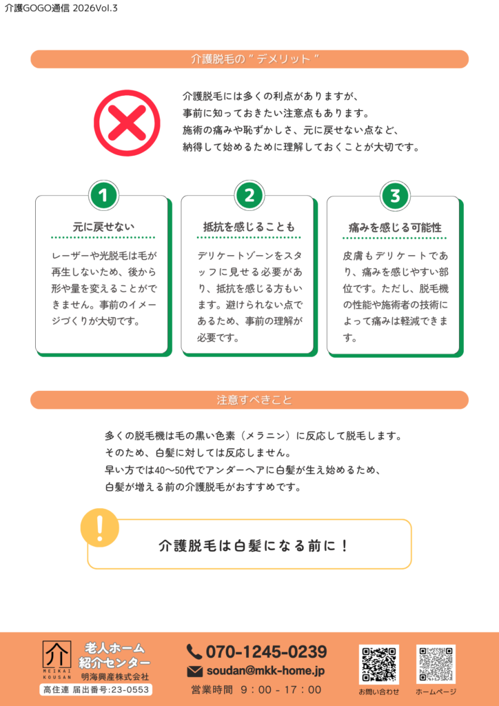 以下では、介護脱毛のメリット・デメリットを整理し、介護に関わる方に分かりやすく解説します。