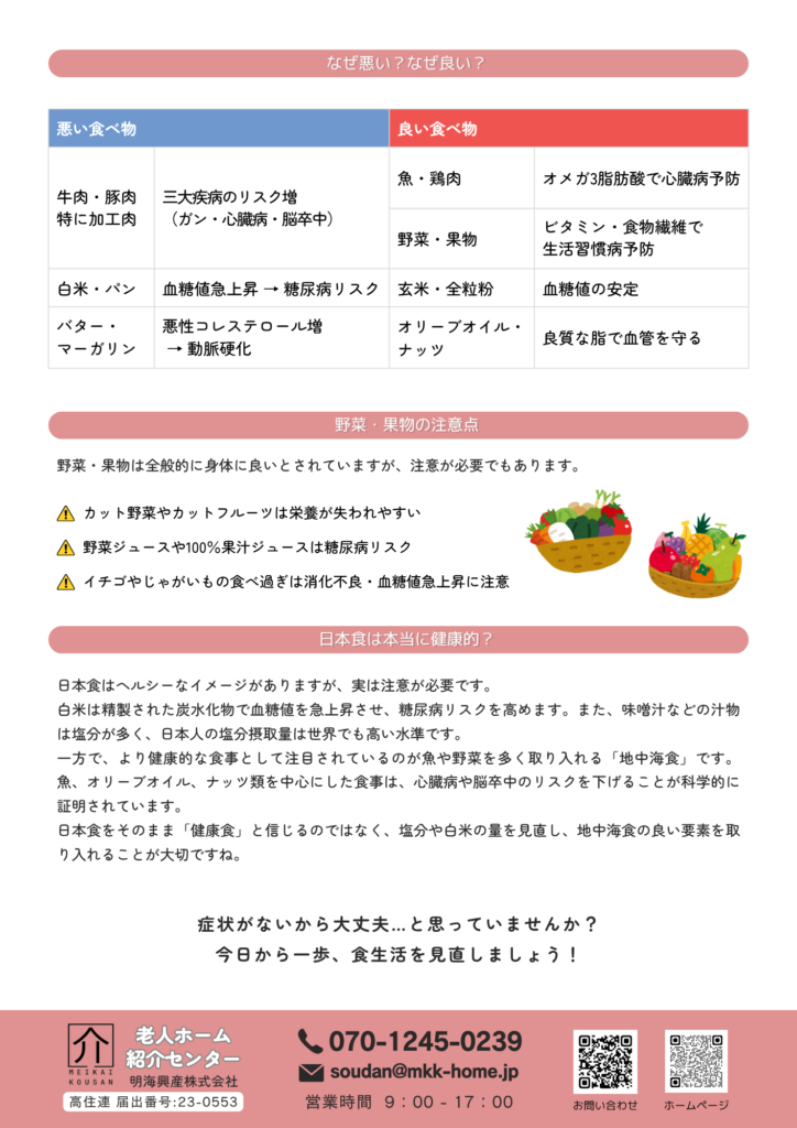 本記事では、高齢者の健康を支えるために意識したい食材選びや食事の工夫について、分かりやすくご紹介します。